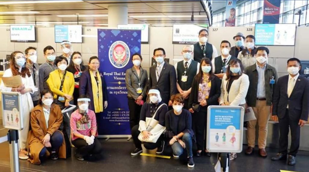 นางสาวมรกต ศรีสวัสดิ์ เอกอัครราชทูต ณ กรุงเวียนนา พร้อมด้วยข้าราชการทีมประเทศไทย และเจ้าหน้ำที่สถานเอกอัครราชทูตฯ ได้ร่วมกันอำนวยความสะดวกให้กับพี่น้องชาวไทย ณ ท่าอากาศยานกรุงเวียนนา โดยดูแลตรวจสอบเอกสารการเดินทาง การจัดแพทย์ตรวจร่างกายและออกเอกสาร Fit to Fly