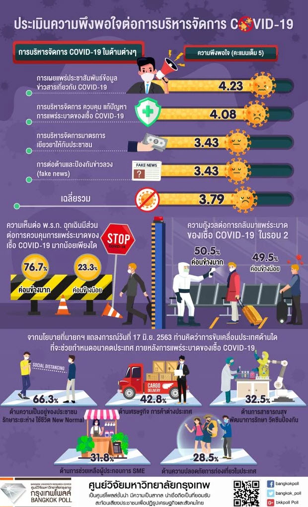 กรุงเทพโพลล์โดยศูนย์วิจัยมหาวิทยาลัยกรุงเทพ ดำเนินการสำรวจความคิดเห็นประชาชน เรื่อง “ประเมินความพึงพอใจต่อการบริหารจัดการ COVID-19” โดยเก็บข้อมูลกับประชาชนจากทุกภูมิภาคทั่วประเทศจำนวน 1,214 คน พบว่า ในภาพรวมประชาชนให้คะแนนความพึงพอใจต่อการบริหารจัดการ COVID-19 ในด้านต่างๆ เฉลี่ย 3.79 จากคะแนนเต็ม 5 คะแนน ซึ่งแปลผลได้ว่ามีความพึงพอใจมาก