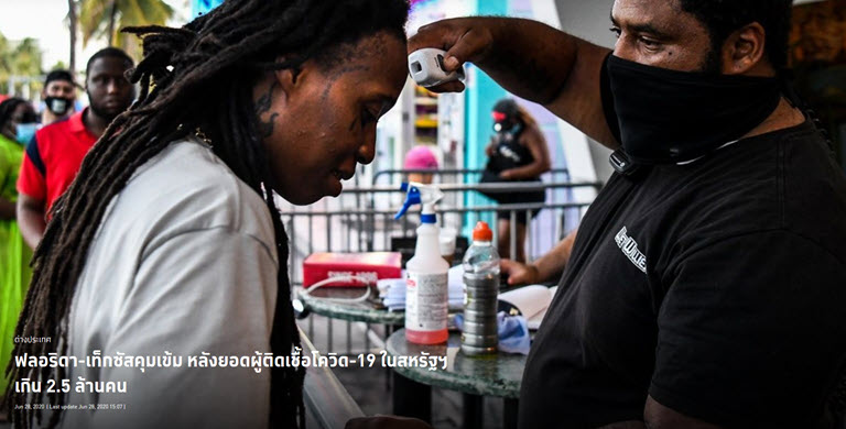 ยอดผู้ติดเชื้อในสหรัฐฯ สูงเกิน 2.5 ล้านคนแล้ว และมีผู้เสียชีวิตจากโควิด-19 ในสหรัฐฯ ไปแล้วมากกว่า 125,000 ราย โดยมลรัฐฟลอริดาและเท็กซัสเป็น 2 มลรัฐที่มียอดผู้ติดเชื้อสูงสุดในประเทศ