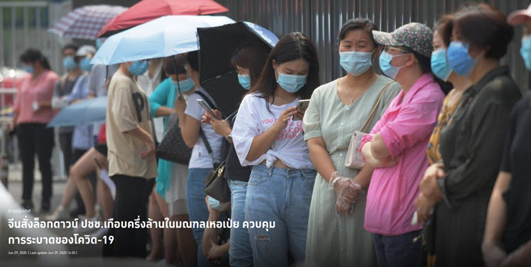 ทั้งนี้ เว็บไซต์ worldometers รายงานว่าจำนวนผู้ติดเชื้อสะสมล่าสุดในจีนอยู่ที่ 83,512 ราย และมียอดผู้เสียชีวิตรวม 4,634 ราย ขณะที่ยอดผู้ติดเชื้อสะสมทั่วโลกอยู่ที่กว่า 10 ล้านราย และมีผู้เสียชีวิตสะสมแล้วกว่า 5 แสนราย