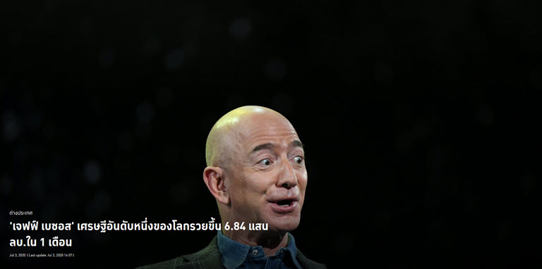 สำนักข่าว CNN รายงานอ้างอิงของมูลจาก Bloomberg Billionaire Index ซึ่งเปิดเผยว่า เจฟฟ์ เบซอส มหาเศรษฐีอันดับ 1 ของโลกทุบสถิติความมั่งคั่งของตัวเองด้วยการเพิ่มมูลค่าทรัพย์สินจาก 150,000 ล้านดอลลาร์สหรัฐฯ หรือกว่า 4.66 ล้านล้านบาทเมื่อช่วงต้นเดือน มิ.ย.ที่ผ่านมา ขึ้นมาเป็น 172,000 ล้านดอลลาร์สหรัฐฯ หรือราว 5.34 ล้านล้านบาท โดยทรัพย์สินส่วนใหญ่ของเบซอสขึ้นอยู่กับมูลค่าทางการตลาดของแอมะซอน ซึ่งปัจจุบันเบซอสถือหุ้นของบริษัทอยู่ราว 57 ล้านหุ้น หรือคิดเป็น 12 เปอร์เซ็นต์ของมูลค่าหุ้นทั้งบริษัท