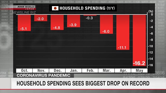 การใช้จ่ายของครัวเรือนญี่ปุ่นลดลงอย่างฮวบฮาบเมื่อเดือนพฤษภาคม โดยลดลงมากที่สุดเป็นประวัติการณ์ ขณะที่การระบาดของไวรัสโคโรนาสายพันธุ์ใหม่ยังคงบีบให้ประชาชนอยู่บ้าน