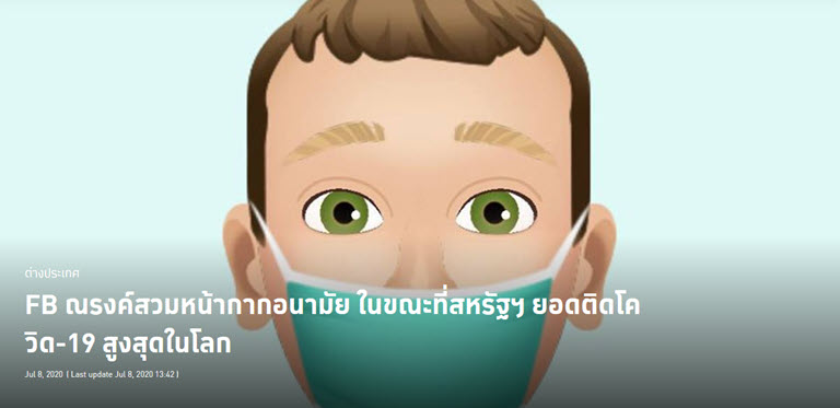 เฟซบุ๊ก “มาร์ก ซักเคอร์เบิร์ก” ซีอีโอเฟซบุ๊ก โพสต์ภาพตัวการ์ตูนแทนตัวเองสวมหน้ากากอนามัย พร้อมข้อความ “Wear a mask” เพื่อเป็นการรณงค์ให้ชาวเฟซบุ๊กสวมใส่หน้ากากอนามัยเพื่อป้องกันการแพร่ระบาดของเชื้อไวรัสโควิด-19 โดยมีบางความเห็นบอกว่าให้ไปบอกทรัมป์ให้สวมหน้ากากอนามัยด้วย