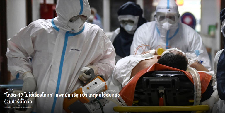 คนไข้ในสหรัฐฯ เสียชีวิตหลังร่วมปาร์ตี้โควิด ทำให้แพทย์แถลงเตือนประชาชนว่า ‘โรคโควิด-19 ไม่ใช่เรื่องโกหก’ ขณะที่ จนท.รัฐเผย วัยรุ่นอเมริกันจัดปาร์ตี้โควิดฯ หลายครั้ง ใครติดเชื้อก่อนจะได้รางวัล ทำให้สถานการณ์แพร่ระบาดยิ่งแย่ลง