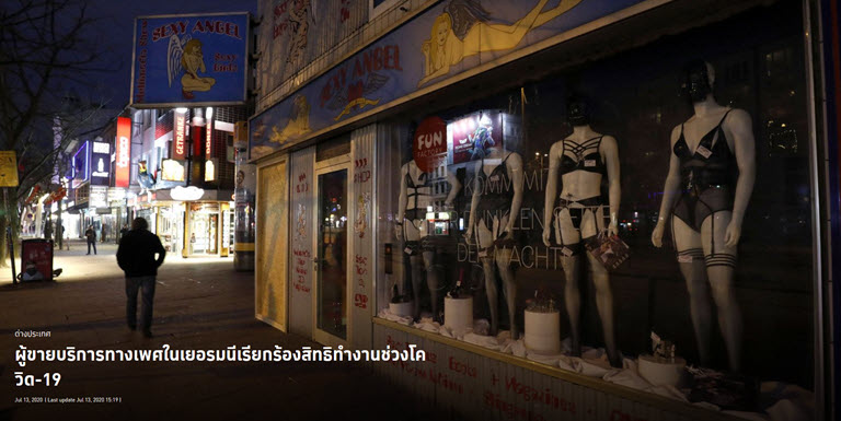 ผู้ขายบริการทางเพศและสถานขายบริการทางเพศจากทั่วเยอรมนีรวมตัวในเขตแฮร์แบร์ตสตราสเซอ พื้นที่สีแดงของเมืองฮัมบวร์ก เพื่อประท้วงเรียกร้องสิทธิในการกลับไปทำงานอีกครั้ง หลังจากต้องปิดไปตั้งแต่เดือน มี.ค.จากการแพร่ระบาดของไวรัสโคโรนา 2019