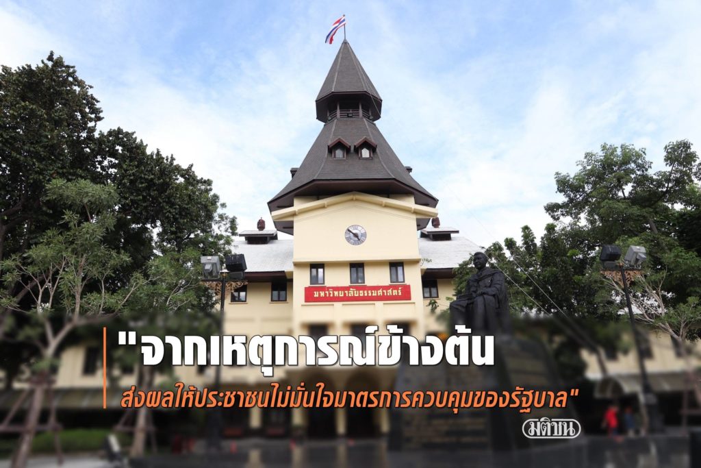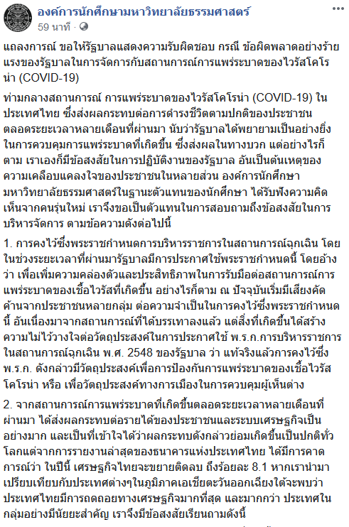 ท่ามกลางสถานการณ์การแพร่ระบาดของไวรัสโคโรนา (COVID-19) ในประเทศไทย ซึ่งส่งผลกระทบต่อการดำรงชีวิตตามปกติของประชาชน ตลอดระยะเวลาหลายเดือนที่ผ่านมา นับว่ารัฐบาลได้พยายามเป็นอย่างยิ่ง ในการควบคุมการแพร่ระบาดที่เกิดขึ้น ซึ่งส่งผลในทางบวก แต่อย่างไรก็ตาม เราเองก็มีข้อสงสัยในการปฏิบัติงานของรัฐบาล อันเป็นต้นเหตุของความเคลือบแคลงใจของประชาชนในหลายส่วน องค์การนักศึกษามหาวิทยาลัยธรรมศาสตร์ในฐานะตัวแทนของนักศึกษา ได้รับฟังความคิดเห็นจากคนรุ่นใหม่ เราจึงขอเป็นตัวแทนในการสอบถามถึงข้อสงสัยในการบริหารจัดการ ตามข้อความดังต่อไปนี้