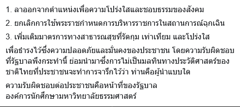 เพื่อธำรงไว้ซึ่งความปลอดภัยและมั่นคงของประชาชน โดยความรับผิดชอบที่รัฐบาลพึงกระทำนี้ ย่อมนำมาซึ่งการไม่เป็นมลทินทางประวัติศาสตร์ของชาติไทย ที่ประชาชนจะทำการจารึกไว้ว่า ท่านคือผู้นำแบบใด ความรับผิดชอบต่อประชาชน คือหน้าที่ของรัฐบาล