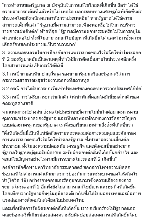 องค์การนักศึกษามหาวิทยาลัยธรรมศาสตร์ขอกล่าวโทษความผิดต่อรัฐบาลที่ไม่สามารถดำเนินมาตรการป้องกันการแพร่ระบาดของไวรัสโคโรนา (โควิด-19) อย่างรอบคอบและรัดกุม จนนำมาซึ่งความเสี่ยงของการระบาดในระลอกที่ 2 อีกทั้งยังไม่สามารถแก้ไขปัญหาเศรษฐกิจที่เกิดขึ้น โดยเทียบจากรัฐบาลอื่นๆ ในภูมิภาคเดียวกัน ซึ่งได้รับผลกระทบและมีสภาพแวดล้อมทางสังคมใกล้เคียงกับประเทศไทย