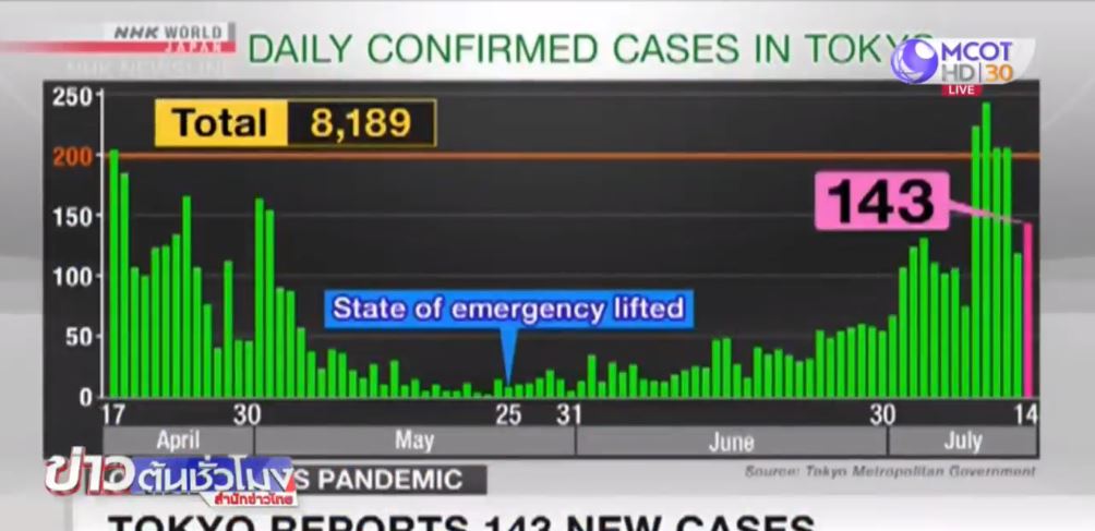 รัฐบาลท้องถิ่นกรุงโตเกียวเร่งหาทางรับมือกับการติดเชื้อโควิด-19 ของกลุ่มคน โดยล่าสุดวานนี้มีผู้ติดเชื้อรายใหม่ในกรุงโตเกียว 143 คน ทำให้ตอนนี้กรุงโตเกียวมีผู้ติดเชื้อสะสมเกือบ 8,200 คน สำหรับผู้ติดเชื้อรายใหม่ในช่วงไม่กี่วันที่ผ่านมา ล้วนเป็นกลุ่มคนหนุ่มสาวที่ทำงาน หรือไปเที่ยวในแหล่งท่องเที่ยวยามค่ำคืน