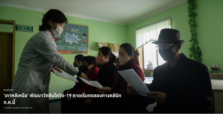 ทั้งนี้ ทางการเกาหลีเหนืออ้างว่า วัคซีนโควิดของเกาหลีเหนือได้รับการยืนยันความปลอดภัยและภูมิคุ้มกันของวัคซีนตัวอย่างในสัตว์และจะเริ่มการทดลองทางคลินิกในเดือนก.ค.นี้