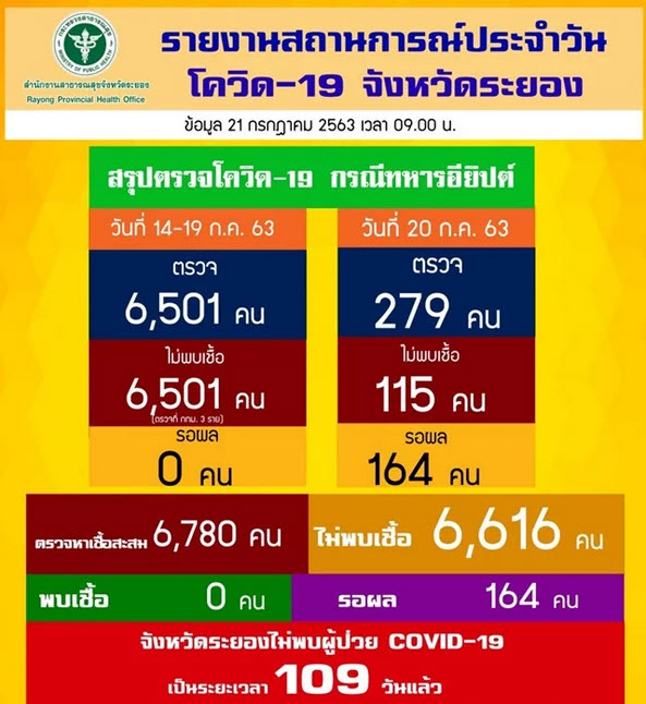 ทั้งนี้ กระทรวงสาธารณสุขได้ทำตรวจหาเชื้อโควิด 19 ในพื้นที่ จ.ระยอง ปัจจุบันตรวจไปแล้วมากกว่า 6,000 คน และให้ผลเป็นลบ ซึ่งเป็นหลักฐานที่บ่งชี้ได้ว่ามาตรการที่ทุกฝ่ายได้ดำเนินการร่วมกันสามารถจำกัดขอบเขตการระบาดได้ โอกาสที่จะพบการแพร่เชื้อจากทหารอียิปต์ในพื้นที่มีต่ำมาก และพื้นที่ระยองมีความเสี่ยงน้อย