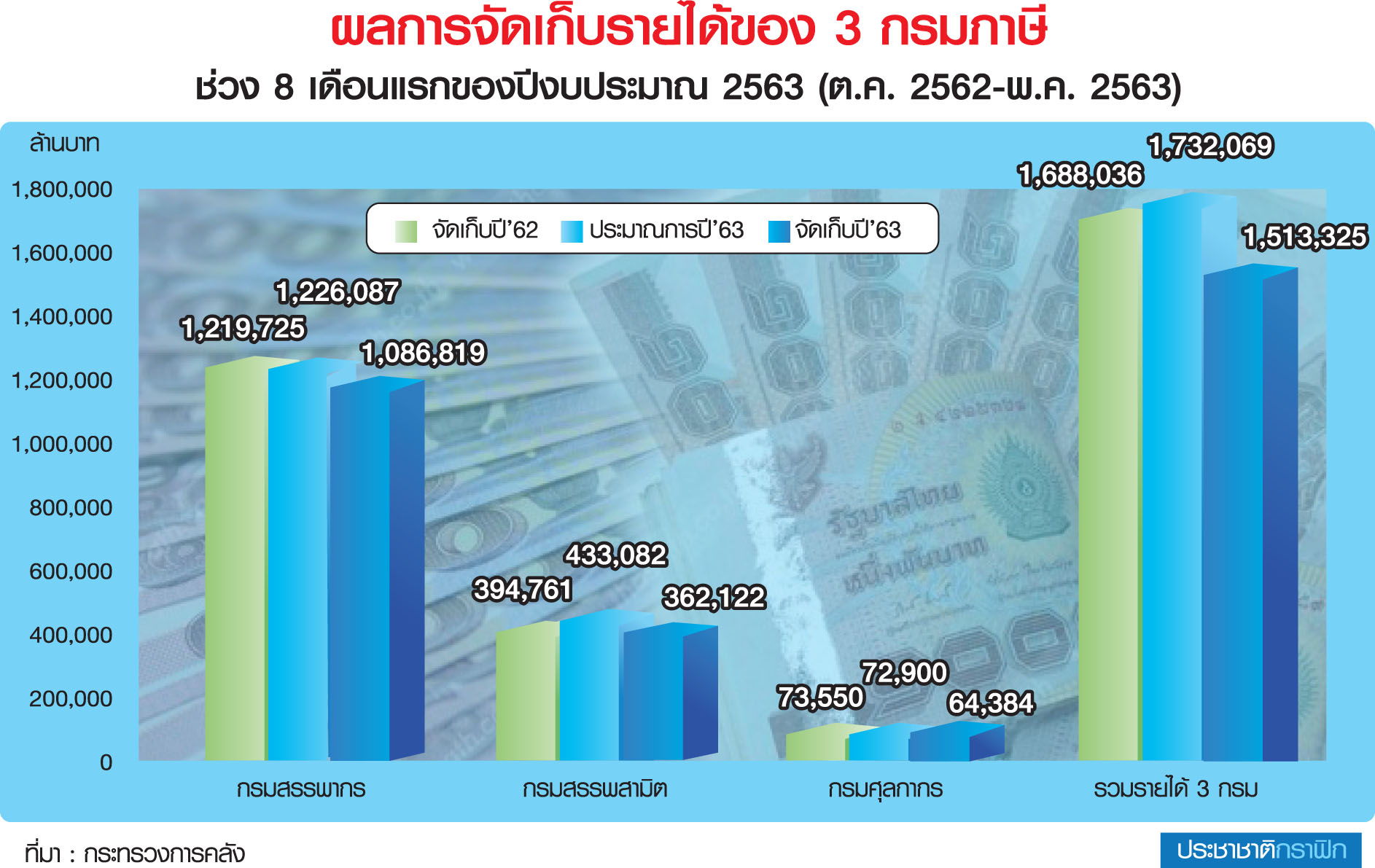 แหล่งข่าวจากกระทรวงการคลัง เปิดเผย “ประชาชาติธุรกิจ” ว่า ในช่วง 8 เดือนแรกของปีงบประมาณ 2563 (ต.ค. 2562-พ.ค. 2563) กรมภาษี 3 กรมเก็บรายได้ต่ำกว่าประมาณการไปถึง 2.18 แสนล้านบาท หรือต่ำเป้า 12.6% โดยกรมสรรพากรเก็บรายได้ต่ำกว่าเป้าไป 1.39 แสนล้านบาท หรือต่ำเป้า 11.4% ขณะที่กรมสรรพสามิตเก็บรายได้ต่ำกว่าเป้าถึง 16.4% หรือหายไปราว 7 หมื่นล้านบาท ส่วนกรมศุลกากรก็เก็บต่ำกว่าเป้า 11.7% หรือต่ำเป้าไป 8,516 ล้านบาท ด้านรัฐวิสาหกิจนำส่งรายได้สูงกว่าเป้า 4,747 ล้านบาท หรือสูงกว่าเป้า 3.3% และหน่วยงานอื่นนำส่งรายได้สูงกว่าเป้ากว่า 1.19 หมื่นล้านบาท หรือสูงกว่าเป้า 10.1%