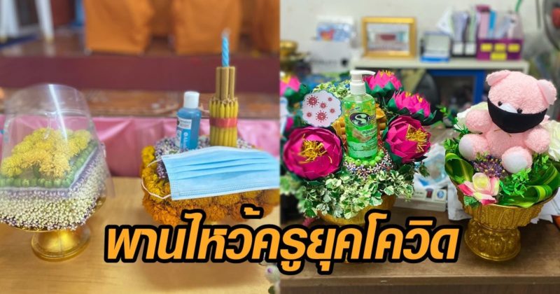 ซึ่งสิ่งหนึ่งที่ ขาดไม่ได้ในงานไหว้ครู ก็คือพานไหว้ครู ที่มักเปลี่ยนไปตามยุคสมัย และสถานการณ์ต่างๆ อย่างในปีนี้ ที่มีการแพร่ระบาดของโควิด 19 ทำให้เหล่านักเรียน นำเอาสิ่งใกล้ตัวอย่าง เจลล้างมือ แมสก์ หรือ เฟซชีลด์ มาร่วมจัดพานไหว้ครู