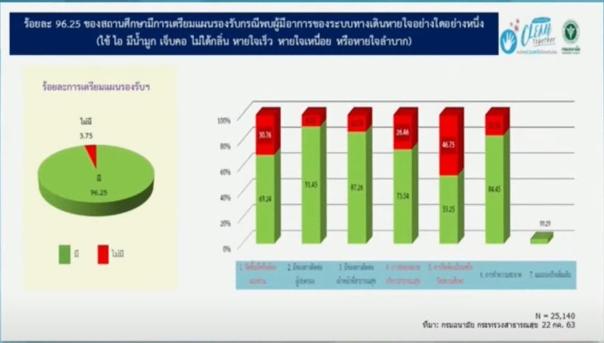นอกจากนี้ นพ.ทวีศิลป์ กล่าวว่า กรมอนามัย สธ.เข้าไปตรวจประเมินและติดตามภายหลังการเปิดภาคเรียน และแนวปฏิบัติของสถานการณ์ความเสี่ยงของการติดโรคในมาตรการผ่อนคลายของสถานศึกษา พบว่า สถานศึกษา จำนวน 25,140 แห่ง มีมาตรการความปลอดภัยการลดการแพร่เชื้อโรคสูงถึงร้อยละ 99.47 แต่มีเพียง 132 แห่งที่ยังปฏิบัติไม่ครบ และได้รับคำชี้แนะเพื่อปรับปรุงแล้ว รายงานการป่วยของเด็กจากทุกแห่ง พบว่า 687 ราย ป่วยเป็นไข้หวัด ไอ น้ำมูก เจ็บคอ หายใจไม่ได้กลิ่น หายใจหอบ แต่ไม่ใช่การติดเชื้อโควิด-19 ซึ่งเป็นจำนวนที่น้อย เนื่องจากมีมาตรการสวมหน้ากากอนามัย ทำให้เด็กป่วยน้อยลง และรายงานแผนรองรับ พบว่า ร้อยละ 96.25 มีแผนรองรับและอีก 3.75 ไม่มีแผนรองรับ จึงต้องมีความจำเป็นลงไปเพิ่มเติมส่วนนี้ให้มากขึ้น หากเกิดกรณีที่เด็กติดเชื้อโควิด-19 ขึ้นเพียง 1 ราย ทางโรงเรียนจะต้องมีแผนรองรับว่า จะดำเนินการปิดสถานศึกษาอย่างไร เช่น ปิดโรงเรียน ปิดชั้นเรียน หรือ ปิดเฉพาะห้องเรียน