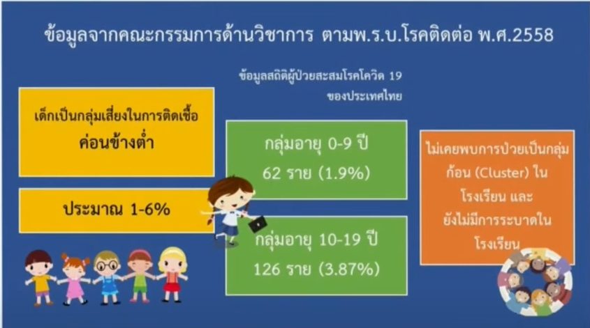 โฆษก ศบค.กล่าวแนวทางมาตรการผ่อนคลายมาตรการของสถานศึกษา ว่า ช่วงนี้เปิดโรงเรียนมาร่วม 1 เดือน ซึ่งช่วงแรกกังวลใจว่า การไปโรงเรียนของเด็กที่มีการเล่นใกล้ชิดกันจะมีการติดเชื้อโควิด-19 โดยขณะนี้ ศบค.ชุดเล็กให้กรมควบคุมโรค กระทรวงสาธารณสุข (สธ.) ร่วมกับกระทรวงศึกษาธิการ (ศธ.) ประเมินรายงานสถานการณ์พบว่า ในช่วง 1 เดือนที่ผ่านมา ยังไม่มีการติดเชื้อในสถานศึกษา โดยมีข้อมูลว่า เด็กเป็นกลุ่มเสี่ยงติดเชื้อที่ค่อนข้างต่ำ และรายงานในประเทศไทยมีผู้ป่วยสะสมในกลุ่มนี้เพียงร้อยละ 1-6 แบ่งกลุ่ม 0-9 ปี 62 ราย ร้อยละ 1.9 และกลุ่มอายุ 10-19 ปี 126 ราย ร้อยละ 3.87