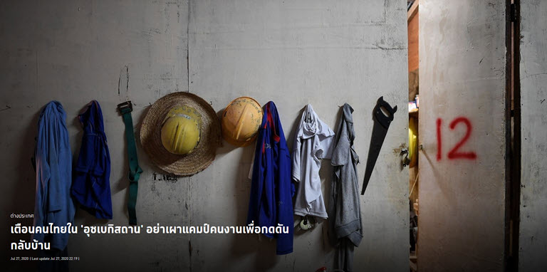 ทั้งนี้เมื่อวันที่ 17 ก.ค.ที่ผ่านมา สื่อไทยรายงานว่าคนงานไทยในอุซเบกิสถานกลุ่มหนึ่งไม่พอใจหัวหน้าคนงานไทยที่นำแรงงานกลุ่มใหม่เข้ามาในแคมป์แรงงานไทยโดยปราศจากการผ่านขั้นตอนการกักตัวในช่วงที่มีการแพร่ระบาดของโควิด-19