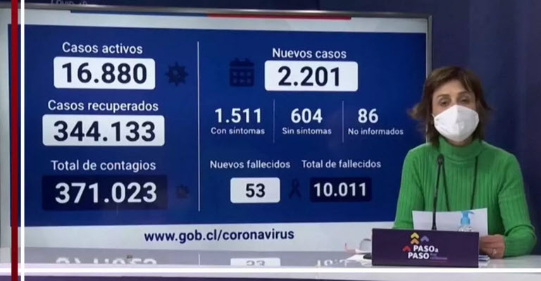 ชิลีนั้นมีพลเมือง 18 ล้านคน มีผู้ติดเชื้อโควิด-19 จำนวน 371,023 คน และเสียชีวิต 10,011 คน ในรอบ 24 ชั่วโมงที่ผ่านมา มีผู้เสียชีวิตเพิ่ม 53 คน และติดเชื้อเพิ่ม 2,201 คน.
