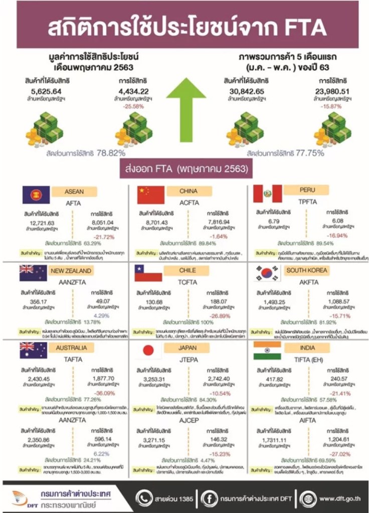 นายกีรติ รัชโน อธิบดีกรมการค้าต่างประเทศ เปิดเผยว่า การใช้สิทธิประโยชน์สำหรับการส่งออกภายใต้ความตกลงการค้าเสรี (FTA) และภายใต้ระบบสิทธิพิเศษทางภาษีศุลกากรเป็นการทั่วไป (GSP) ระหว่างเดือนมกราคม-พฤษภาคม 2563 โดยมูลค่าการใช้สิทธิฯ รวมเท่ากับ 26,068.51 ล้านเหรียญสหรัฐฯ มีสัดส่วนการใช้สิทธิฯ 77.53% แบ่งเป็นมูลค่าการใช้สิทธิประโยชน์ภายใต้ความตกลงการค้าเสรี (FTA) 23,980.51 ล้านเหรียญสหรัฐฯ และมูลค่าการใช้สิทธิประโยชน์ภายใต้ระบบสิทธิพิเศษทางภาษีศุลกากรเป็นการทั่วไป (GSP) 2,088 ล้านเหรียญสหรัฐฯ