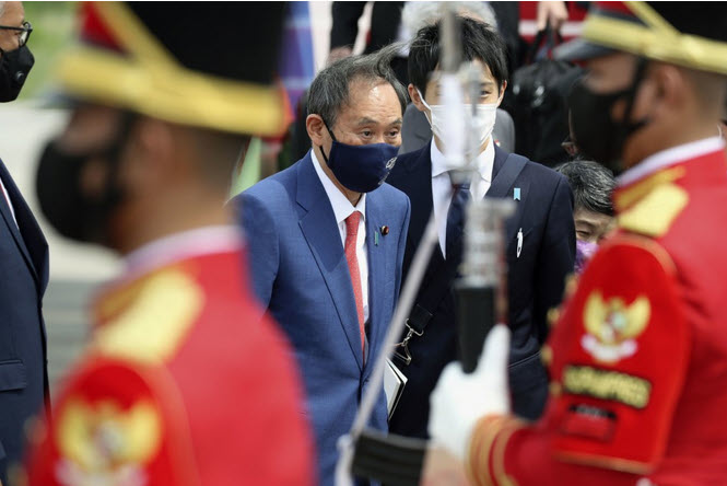 Suga arrived in Jakarta in the afternoon from Hanoi, where he met with his Vietnamese counterpart Nguyen Xuan Phuc on Monday.
