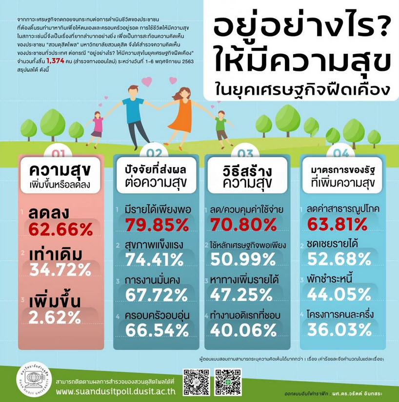 สวนดุสิตโพล มหาวิทยาลัยสวนดุสิต สำรวจความคิดเห็นของประชาชน เรื่อง “อยู่อย่างไร ให้มีความสุขในยุคเศรษฐกิจฝืดเคือง” โดยเมื่อถามว่าภาวะเศรษฐกิจในปัจจุบัน มีผลทำให้ความสุขของประชาชนเพิ่มขึ้นหรือลดลง พบว่า ประชาชนส่วนใหญ่ 62.66% ตอบว่ามีผลให้ความสุขของประชาชนลดลง