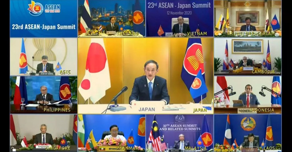 นายซูงะเข้าร่วมการประชุมสุดยอดอาเซียนผ่านระบบการประชุมทางไกลร่วมกับอีก 10 ผู้นำจากประเทศสมาชิก ซึ่งถือเป็นการประชุมพหุภาคีครั้งแรกตั้งแต่เข้ารับตำแหน่งนายกรัฐมนตรีญี่ปุ่นในเดือนกันยายนที่ผ่านมา นายซูงะกล่าวในช่วงต้นของการประชุมว่า ญี่ปุ่นได้ใช้เงินทุนก่อตั้งศูนย์เฉพาะกิจ เพื่อเพิ่มขีดความสามารถของสมาคมอาเซียนในการรับมือกับโรคโควิด-19 และจะเดินหน้าพัฒนาศูนย์ดังกล่าวให้กลายเป็นองค์กรที่จะมีบทบาทสำคัญในการปกป้องพลเมืองของภูมิภาคนี้ นายซูงะยังกล่าวเพิ่มเติมว่า ญี่ปุ่นยังคงให้การสนับสนุนแนวคิดของสมาคมอาเซียนอย่างเต็มที่ เนื่องจากมีประเด็นสำคัญหลายอย่างที่ตรงกับวิสัยทัศน์ของญี่ปุ่นที่ต้องการให้ภูมิภาคอินโด-แปซิฟิกมีเสรีและเปิดกว้าง ทั้งยังแสดงความวิตกกังวลเกี่ยวกับความพยายามข้างเดียวที่จะเปลี่ยนสถานภาพของทะเลจีนใต้และทะเลจีนตะวันออก นอกจากนี้ นายซูงะยังได้เผยถึงแผนงานของญี่ปุ่นในการลดปริมาณการปล่อยก๊าซเรือนกระจกเป็นศูนย์ในปี 2593 อีกด้วย