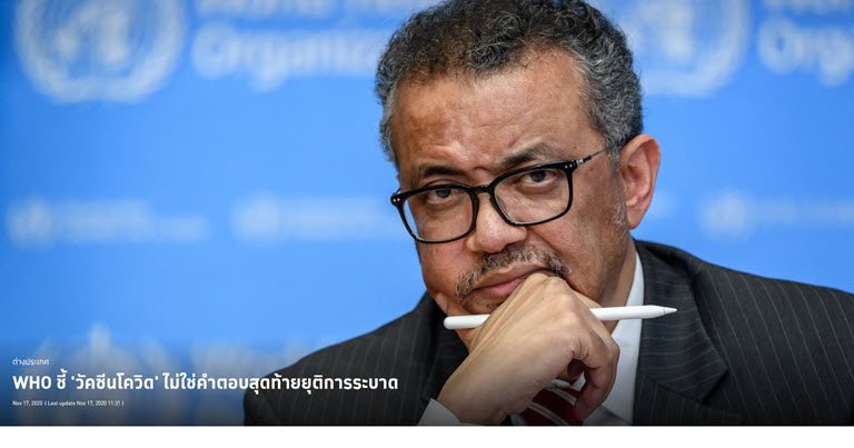 ดร.เทดรอส อัดฮานอม เกเบรเยซุส ผู้อำนวยการองค์การอนามัยโลก (WHO) ออกมาเตือนว่า วัคซีนป้องกันโควิด-19 ที่ก่อนหน้านี้บริษัทยายักษ์ใหญ่เปิดเผยผลการทดลองในระยะ 3 ว่า ได้ผลดีและมีประสิทธิภาพในการป้องกันการติดเชื้อได้กว่า 90% นั้น ไม่ใช่สิ่งสุดท้ายที่จะช่วยยุติการระบาดของโควิด-19 ในทั่วโลก