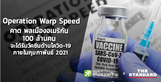 วันนี้ (3 ธันวาคม) โครงการ Operation Warp Speed ของรัฐบาลสหรัฐอเมริกา ที่สนับสนุนการคิดค้นและทดสอบวัคซีนต้านโควิด-19 ในหลายโปรเจกต์ทั่วโลกคาดว่า พลเมืองอเมริกันราว 100 ล้านคนจะได้รับวัคซีนต้านโควิด-19 ภายในเดือนกุมภาพันธ์ 2564