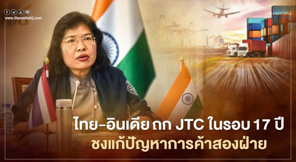 ไทย-อินเดียฟื้นการประชุมJTC ครั้งแรกในรอบ 17 ปี เพื่อแก้ไขปัญหาอุปสรรคทางการค้า เผยไทยได้ใช้โอกาสนี้ขอให้อินเดียพิจารณากรณีจำกัดการนำเข้าสินค้าไทยหลายรายการ ปัญหากฎถิ่นกำเนิดสินค้าใหม่ที่ไม่ชัดเจน พร้อมชวนเข้าร่วมงานแสดงสินค้าของไทย ทั้งที่จัดในอินเดียและในไทย