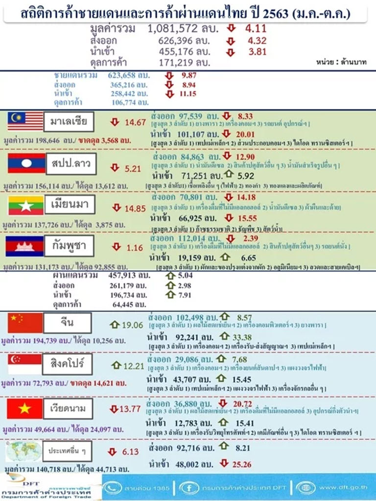 นายกีรติ รัชโน อธิบดีกรมการค้าต่างประเทศ เปิดเผยว่า สถิติการค้าชายแดนและผ่านแดนของไทย ช่วง ม.ค.-ต.ค.63 มีมูลค่ารวมทั้งสิ้น 1,081,572 ล้านบาท ลดลง -4.11% เมื่อเทียบกับช่วงเดียวกันของปีก่อน แบ่งเป็นการส่งออก 626,396 ล้านบาท ลดลง -4.32% และการนำเข้า 455,176 ล้านบาท ลดลง -3.81% ไทยเกินดุลการค้า 171,219 ล้านบาท