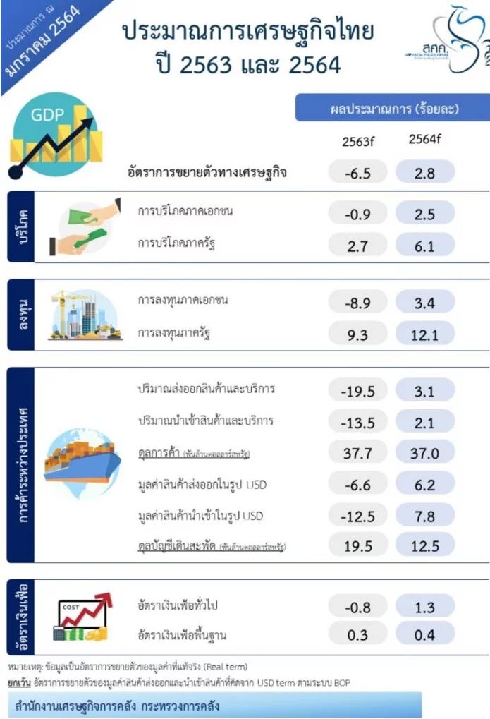 - สศค. ปรับลดคาดการณ์เศรษฐกิจไทย (GDP) ปี 63 หดตัว -6.5% จากเดิมคาด -7.7%