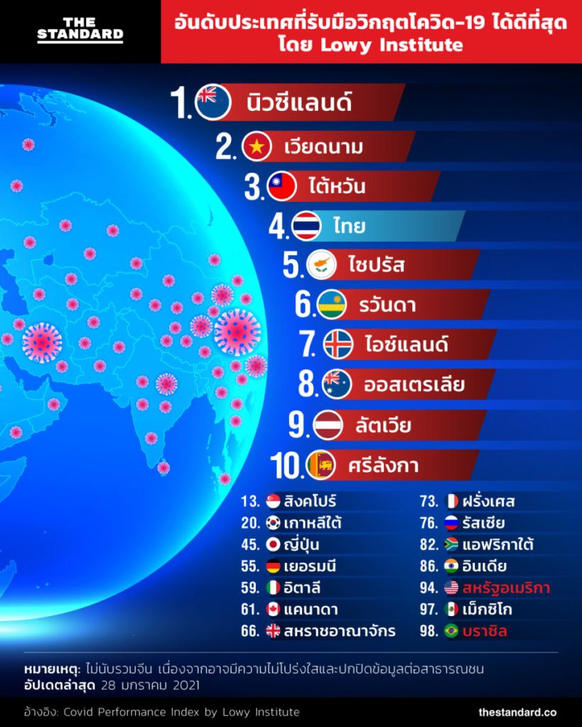 จากการประเมินและจัดอันดับประเทศและดินแดน 98 แห่งจากทุกทวีปทั่วโลก โดยกลุ่ม Think Tank ในออสเตรเลียอย่าง Lowy Institute ที่พิจารณาถึง 6 ตัวชี้วัดสำคัญ ไม่ว่าจะเป็นจำนวนยอดผู้ติดเชื้อสะสม จำนวนผู้เสียชีวิต อัตราส่วนของผู้ติดเชื้อต่อจำนวนประชากร 1 ล้านคน อัตราส่วนของผู้เสียชีวิตต่อจำนวนประชากร 1 ล้านคน รวมถึงการตรวจหาการติดเชื้อเป็นอย่างไร มากน้อยแค่ไหน และอัตราส่วนของผู้ติดเชื้อต่อการตรวจหาการติดเชื้อเป็นเท่าใด
