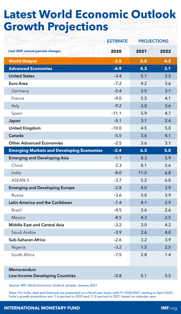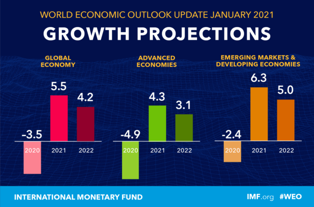 เศรษฐกิจโลกจะแข็งแกร่งขึ้นในครึ่งหลังของปีจากที่หดตัว 3.5% ในปี 2020 โดยคาดว่าจะขยายตัว 5.5% ในปี 2021 และเติบโต 4.2% ในปี 2022 ซึ่งดีขึ้นจากการประมาณการครั้งก่อนในเดือนตุลาคม 2020