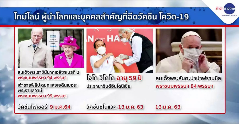 - ประธานาธิบดีโจโก วิโดโด ของอินโดนีเซีย วัย 59 ปี ฉีดวัคซีนคนแรกของประเทศ เมื่อวันที่ 13 ม.ค. 64 เป็นวัคซีนบริษัทซิโนแวคไบโอเทคของจีน โดยอินโดนีเซียเป็นประเทศแรกนอกจากจีนที่อนุมัติใช้วัคซีนตัวนี้