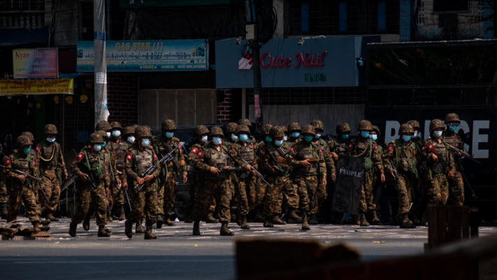 Military soldiers walk down a street while carrying weapons that contain live ammunition after clashes with anti-coup protesters on March 3, 2021, in Yangon. (Getty/Kyodo)