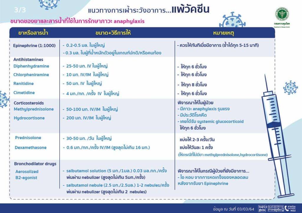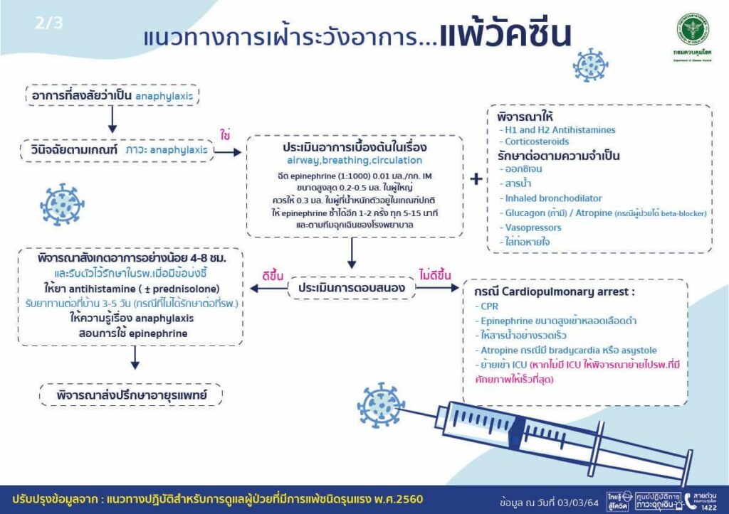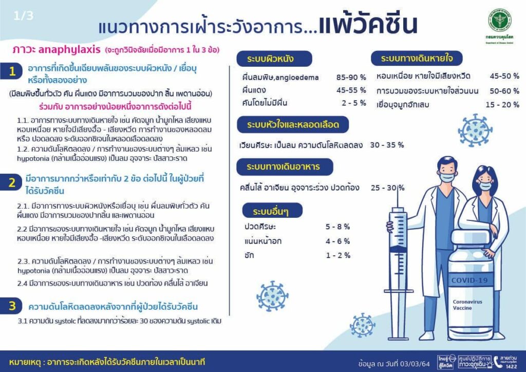 เมื่อวันที่ 3 มีนาคม กรมควบคุมโรค กระทรวงสาธารณสุข ได้โพสต์เฟซบุ๊ก ถึงแนวทางการเฝ้าระวังอาการ…แพ้วัคซีน ดังนี้