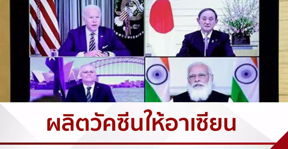 วอชิงตัน 13 มี.ค.- กลุ่มจตุภาคีหรือควอด (Quad) ที่ประกอบด้วยอินเดีย สหรัฐ ญี่ปุ่น และออสเตรเลีย รับปากจะส่งมอบวัคซีนป้องกันโรคติดเชื้อไวรัสโคโรนา 2019 หรือโควิด-19 ให้แก่อาเซียน และหลายภูมิภาคภายในสิ้นปีหน้า