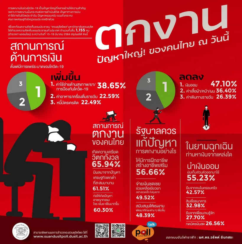 “สวนดุสิตโพล” มหาวิทยาลัยสวนดุสิต เผยผลสำรวจความคิดเห็นของประชาชนทั่วประเทศ เรื่อง “ตกงาน ปัญหาใหญ่ของคนไทยวันนี้” โดยเมื่อถามถึงสถานการณ์การเงินของประชาชน ตั้งแต่มีการแพร่ระบาดของโควิด-19 ว่าเป็นอย่างไรนั้น พบว่า อันดับแรกที่เพิ่มขึ้น คือ ค่าใช้จ่ายด้านสุขภาพ, ยา, การป้องกันโควิด-19 ส่วนอันดับแรกที่ลดลง คือ เงินออม