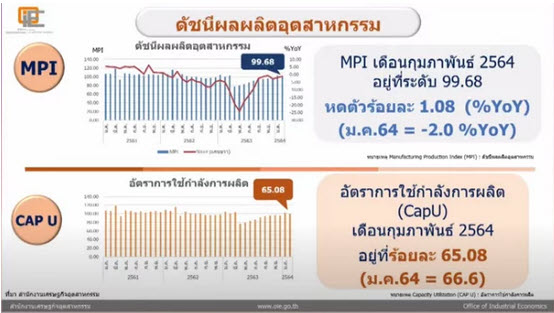 สำหรับอัตราการใช้กำลังการผลิต (CapU) เดือน ก.พ.64 อยู่ที่ 65.08% ลดลงจาก 66.6% ในเดือน ม.ค.64