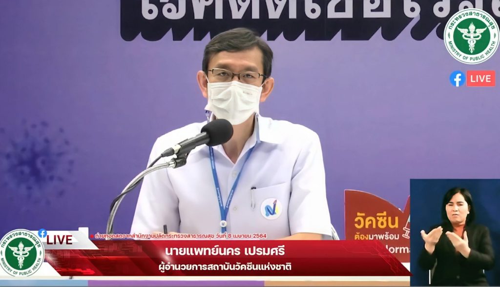 “กรณีมีรายงานจากหน่วยงานกำกับดูแลด้านยาและผลิตภัณฑ์สุขภาพของสหราชอาณาจักร (MHRA) และหน่วยงานกำกับดูแลด้านยาและผลิตภัณฑ์สุขภาพของยุโรป (EMA) เกี่ยวกับกรณีภาวะลิ่มเลือดอุดตันร่วมกับภาวะเกล็ดเลือดของผู้ที่ได้รับวัคซีนโควิด-19 ของแอสตร้าฯ โดย 2 หน่วยงานสรุปว่า เป็นผลข้างเคียงที่เกิดขึ้นได้น้อยมาก อัตรา 2-4 ต่อล้านการฉีด ซึ่งมีความเป็นไปได้ว่าสัมพันธ์กับการได้วัคซีน โดยมีข้อสังเกตว่าเกิดขึ้นหลังการฉีดเข็มที่ 1” นพ.นคร กล่าว