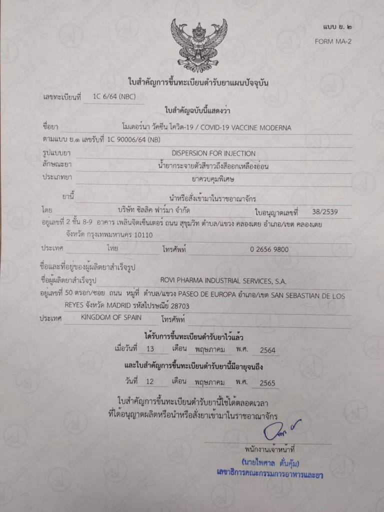 น.ส.ไตรศุลี ไตรสรณกุล รองโฆษกประจำสำนักนายกรัฐมนตรี โพสต์ข้อความผ่านเฟซบุ๊กส่วนตัวระบุว่า ขณะนี้สำนักงานคณะกรรมการอาหารและยา (อย.) ได้ขึ้นทะเบียนวัคซีนโควิด-19 ของโมเดอร์นา ให้สามารถนำเข้ามาในประเทศได้แล้วมีผลตั้งแต่วันนี้ โดยการนำเข้าของบริษัท ซีลลิค ฟาร์มา จำกัด ซึ่งใบอนุญาตดังกล่าวจะมีอายุถึงวันที่ 12 พ.ค.65