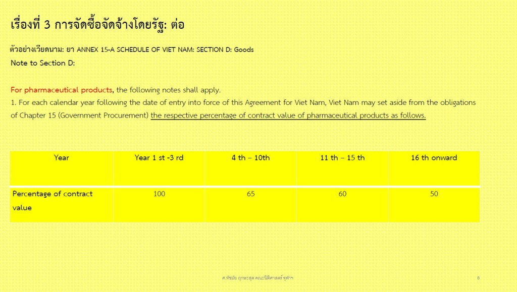 ส่วนเรื่องยาจากข้อมูลที่มีองค์การเภสัชมีสัดส่วนในการจัดซื้อจัดจ้าง 30% ของการจัดซื้อจัดจ้าง เวียดนามระบุไว้ใน Annex15-A Section D ว่า ขอเวลา 15 ปี แต่เมื่อครบกำหนดก็ไม่ได้ให้เต็ม เวียดนามยังสามารถทำให้หน่วยงานจัดซื้อจัดจ้างยาได้ด้วยตัวเอง โดยที่ต่างชาติไม่สามารถเข้ามาได้ในปีที่ 16 เป็นต้นไปนอกจากจะเจรจาใหม่แต่ตามตัวบทยังได้ 50% ซึ่งสูงกว่า 30% ขององค์การเภสัชของไทย