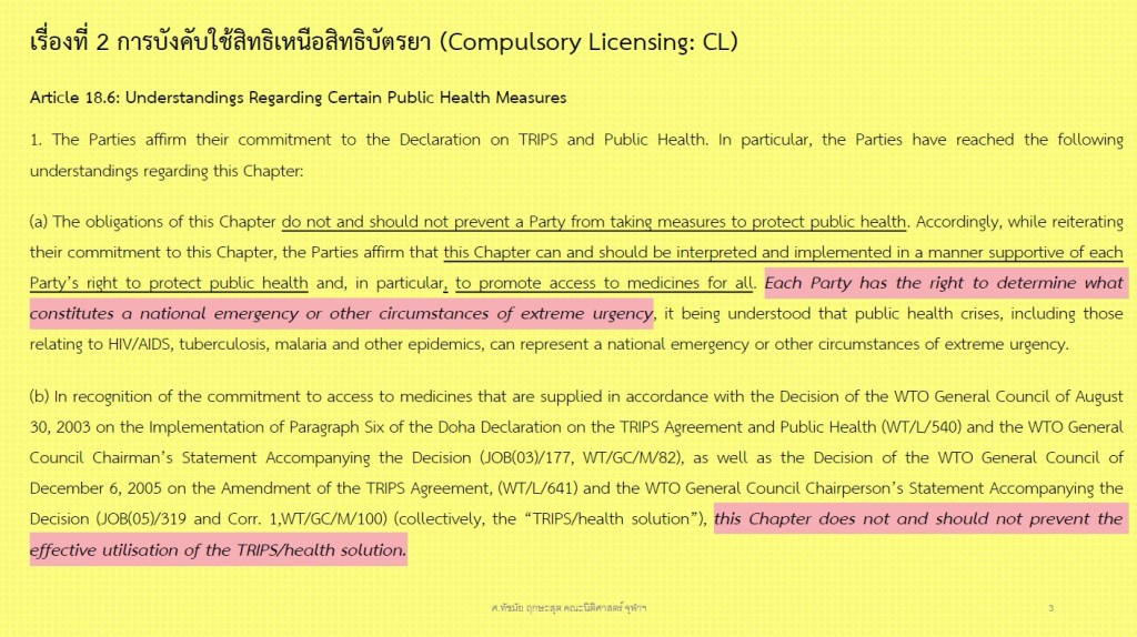 ศาตราจารย์ทัชมัยกล่าวว่า “วันนี้เราทำ CL ยาได้อย่างไร เข้า CPTPP ก็ยังทำได้เหมือนเดิม ในมาตรา 18 วรรค 6 ของ CPTPP ระบุว่า การตัดสินว่าประเทศมีวาระเร่งด่วนหรือภาวะฉุกเฉิน ประเทศที่เป็นภาคีเป็นผู้ตัดสินใจ ตราบใดที่ใช้ CL ตาม TRIPS” ซึ่งประเทศไทยใช้มาตลอด