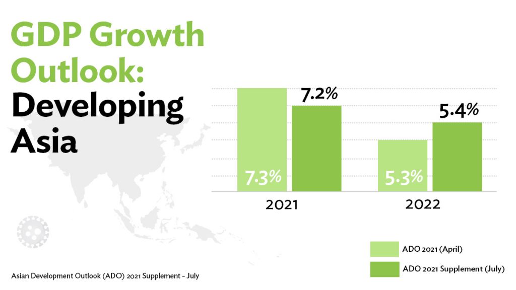 มะนิลา ฟิลิปปินส์ (20 กรกฎาคม 2564) – ธนาคารพัฒนาเอเชีย (Asian Development Bank) หรือ เอดีบี คาดว่าเศรษฐกิจในประเทศเอเชียกำลังพัฒนาจะเติบโตที่ร้อยละ 7.2 ในปีนี้จากที่เคยคาดการณ์ไว้ที่ร้อยละ 7.3 ในเดือนเมษายนที่ผ่านมา เนื่องจากการระบาดของโรคติดเชื้อโคโรนาไวรัส (COVID-19) ระลอกใหม่ทำให้การฟื้นตัวทางเศรษฐกิจช้าลงในบางประเทศในภูมิภาค ส่วนแนวโน้มการเติบโตทางเศรษฐกิจในปี 2565 นั้นจะปรับขึ้นจากร้อยละ 5.3 เป็นร้อยละ 5.4