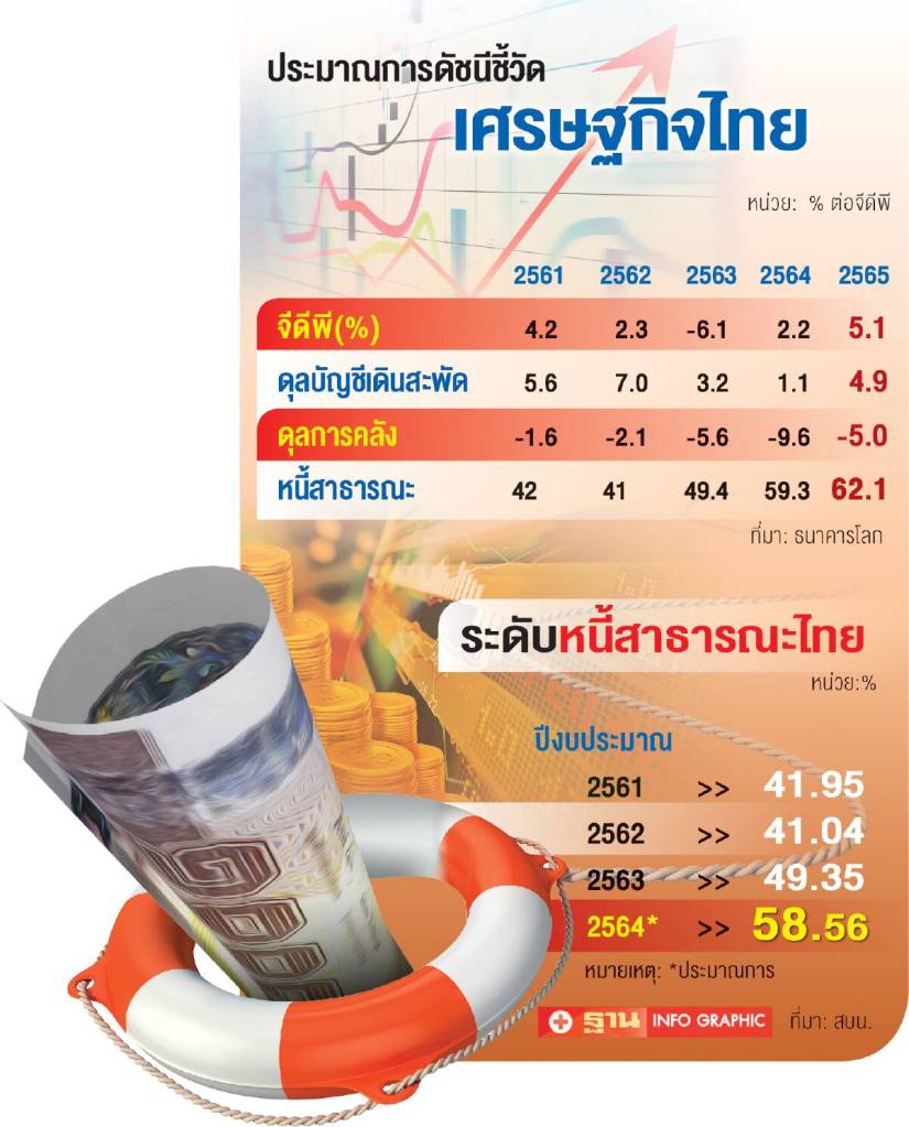 โควิด-19 ระลอกใหม่ ถล่มเอเชียตะวันออกเฉียงใต้ เวิลด์แบงก์ปรับลดคาดการณ์ จีดีพี ปี 64 ถ้วนหน้ารวมถึงไทย มองหนี้สาธารณะปี 65 ทะลุเพดานความยั่งยืนการคลัง แตะ 62.1% สบน.รับยังไม่เรียกประชุมเพิ่มเพดานหนี้ สศค.แนะ 4 แสนร้านค้า ถุงเงิน สมัคร ม.40 รับเยียวยา 5,000 บาท