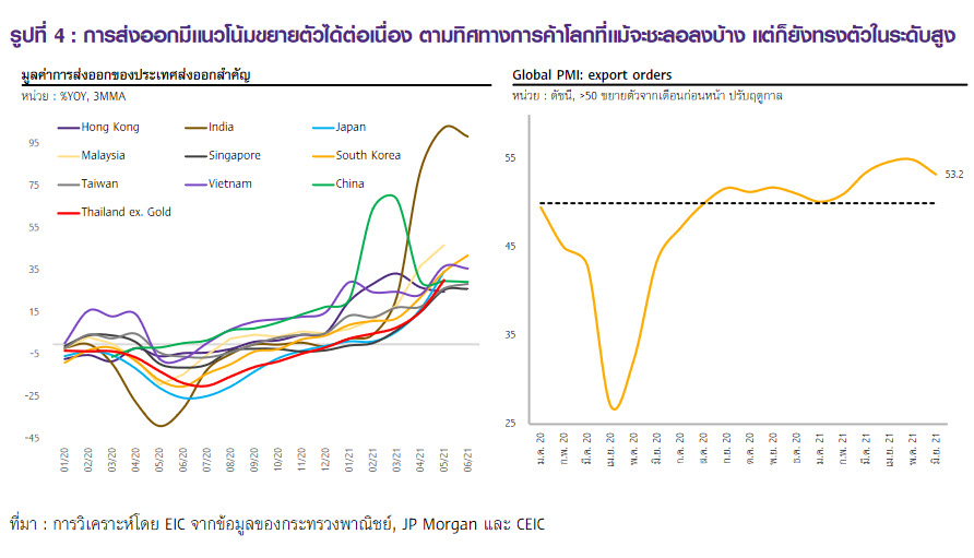 สอดคล้องกับดัชนี Global PMI: Export orders และมูลค่าการส่งออกของประเทศในภูมิภาคที่ยังอยู่ในระดับสูงต่อเนื่อง ทำให้ EIC ยังคงคาดการณ์ส่งออกไทยที่ 15.0% ในปีนี้ แต่ต้องจับตาความเสี่ยงที่อาจเกิดขึ้นได้โดยเฉพาะปัญหา supply disruptionที่เกิดจากการปิดโรงงานจากการระบาดทั้งในไทยและประเทศอื่น ๆ ที่อยู่ในห่วงโซ่การผลิตเดียวกับไทย ผลกระทบด้านอุปสงค์จากการระบาดในเศรษฐกิจประเทศอาเซียนที่เป็นคู่ค้าสำคัญของไทย ตลอดจนการขาดแคลนตู้คอนเทนเนอร์ที่ทำให้ค่าระวางเรือยังอยู่ในระดับสูงต่อเนื่องและการขาดแคลนชิปที่อาจกระทบต่ออุตสาหกรรมยานยนต์และอิเล็กทรอนิกส์
