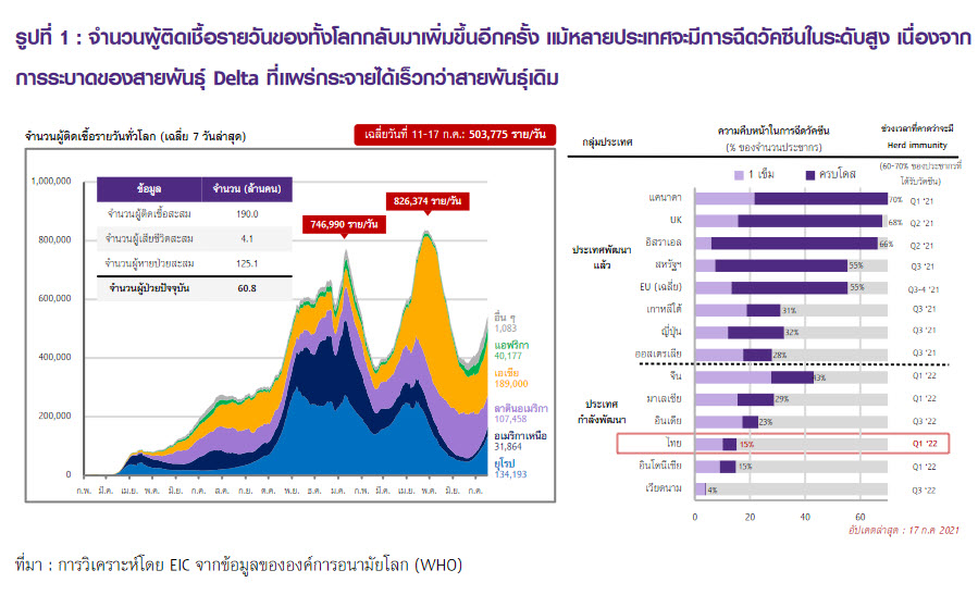 โดยกลุ่มประเทศกำลังพัฒนาจะได้รับผลกระทบมากกว่า เนื่องจากมีความคืบหน้าในการฉีดวัคซีนไม่สูงนักCOVID-19 กลับมาระบาดอีกครั้งจากการระบาดของสายพันธุ์ Delta โดยจากรูปที่ 1 จะเห็นได้ว่าจำนวนผู้ติดเชื้อรายวันทั่วโลกกลับมาเพิ่มขึ้นอีกครั้งหลังจากลดลงในช่วงก่อนหน้า แม้กลุ่มประเทศพัฒนาแล้วหลายประเทศจะมีการฉีดวัคซีนในระดับสูง ทั้งนี้เนื่องจากสายพันธุ์ Delta ซึ่งเป็นสายพันธุ์หลักที่มีการระบาดในช่วงนี้ เป็นสายพันธุ์ที่มีความสามารถในการแพร่กระจายได้เร็วกว่าสายพันธุ์เดิม ทำให้วัคซีนหลายประเภทมีประสิทธิภาพลดลงในการป้องกันการแพร่เชื้อ