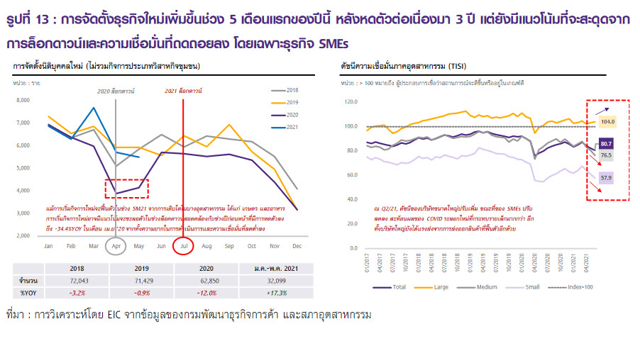 ขณะที่สาขาที่ได้รับผลกระทบรุนแรงอย่างกลุ่มโรงแรมยังคงหดตัวต่อเนื่อง อย่างไรก็ตาม EIC มองว่าการเปิดกิจการใหม่ของนิติบุคคลมีแนวโน้มที่จะชะลอตัวในช่วงล็อกดาวน์ คล้ายคลึงกับที่เกิดขึ้นในช่วงล็อกดาวน์ปีที่แล้วจากทั้งอุปสรรคในการดำเนินการ สภาพเศรษฐกิจที่ถดถอยลง อีกทั้ง ความเชื่อมั่นของผู้ประกอบการยังลดต่ำลงอีกด้วย