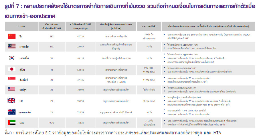 • นโยบายการเดินทางเข้าออกประเทศของหลายประเทศที่ยังเป็นไปอย่างระมัดระวัง ตามความกังวลเกี่ยวกับการระบาดของไวรัสสายพันธุ์ใหม่ โดยเมื่อพิจารณามาตรการของประเทศที่เป็นนักท่องเที่ยวกลุ่มหลักของไทย พบว่า ภาครัฐในบางประเทศยังมีข้อจำกัดในการเดินทางออกนอกประเทศอยู่ โดยอนุญาตให้เดินทางมาไทยเพื่อธุรกิจเท่านั้น เช่น จีน สิงคโปร์ และญี่ปุ่น เป็นต้น