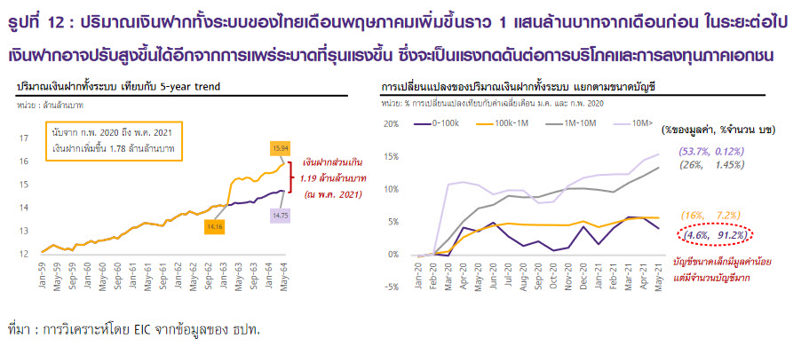 นอกจากนี้ จากสถานการณ์ที่แย่ลง ยังมีแนวโน้มทำให้ประชาชนหันไปออมมากขึ้น (Precuationary saving) โดยจากข้อมูลพบว่าเงินฝากทั้งระบบของไทยปรับเร่งตัวขึ้นในเดือนพฤษภาคม หลังจากการระบาดระลอกที่ 3 ในเดือนเมษายน ซึ่งเงินฝากทั้งระบบของไทยนับจากเดือนกุมภาพันธ์ 2020 ถึงเดือนพฤษภาคม 2021 ปรับเพิ่มขึ้น 1.78 ล้านล้านบาท และหากเทียบในเดือนพฤษภาคมกับเดือนเมษายน 2021 ก็ปรับเพิ่มขึ้นราว 1 แสนล้านบาท