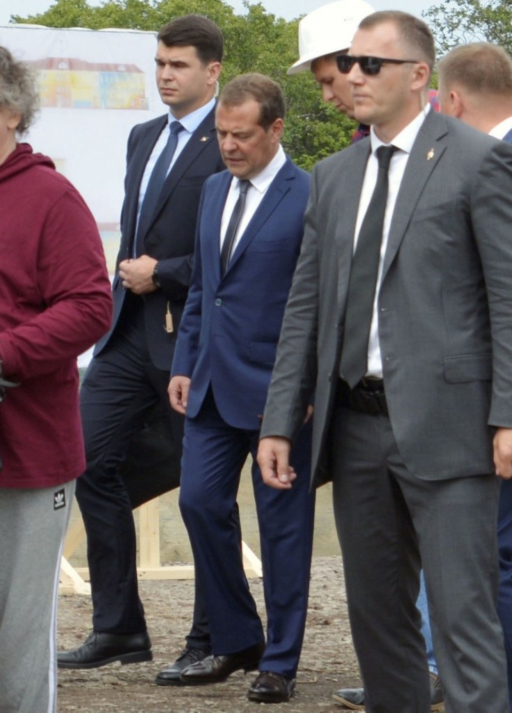 Russian Prime Minister Dmitry Medvedev (C) visits Etorofu Island, one of the four Russia-held islands off Hokkaido that are claimed by Japan, on Aug. 2, 2019. (Kyodo) ==Kyodo